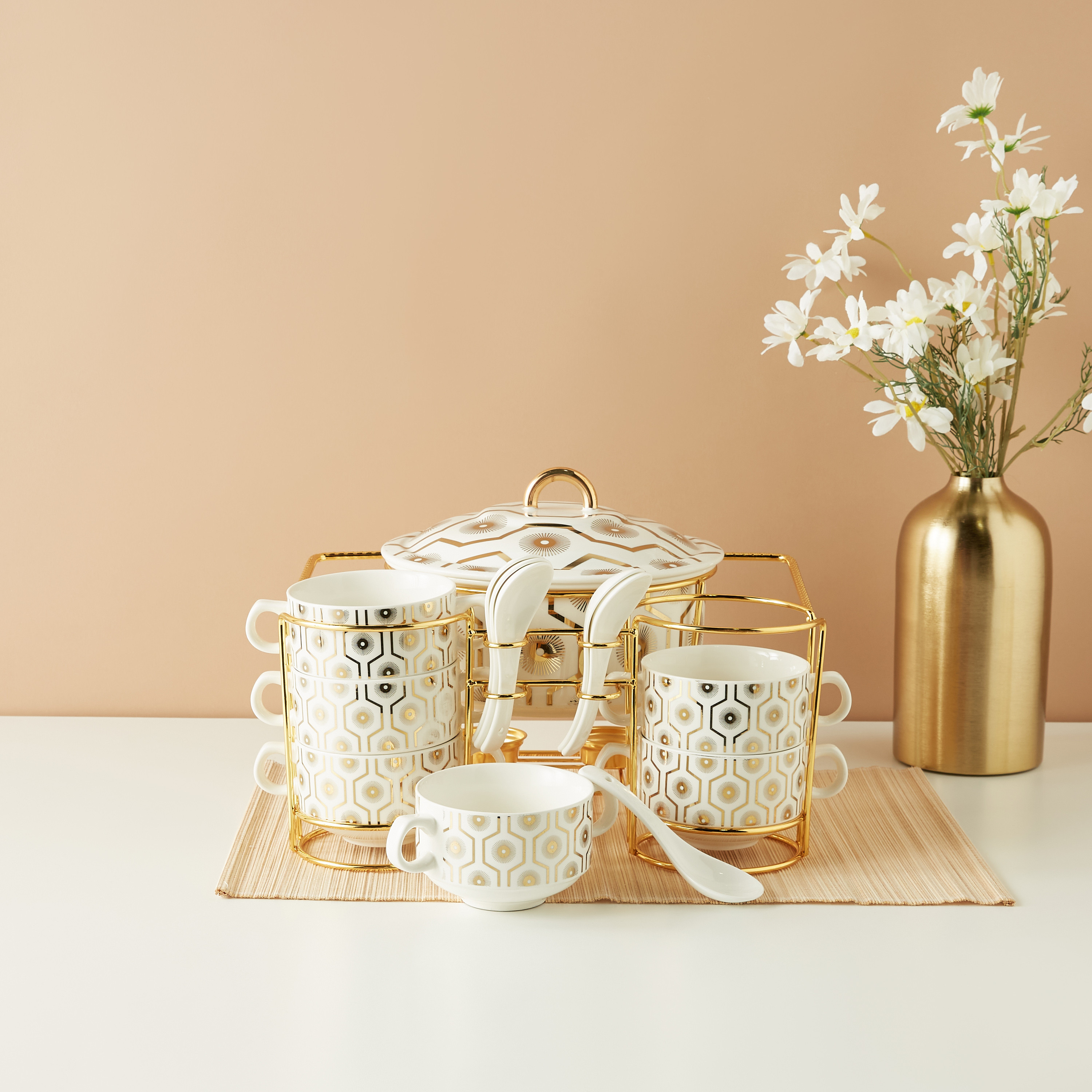 All-Over Printed 15-Piece Ceramic Soup Serving Set with Stand