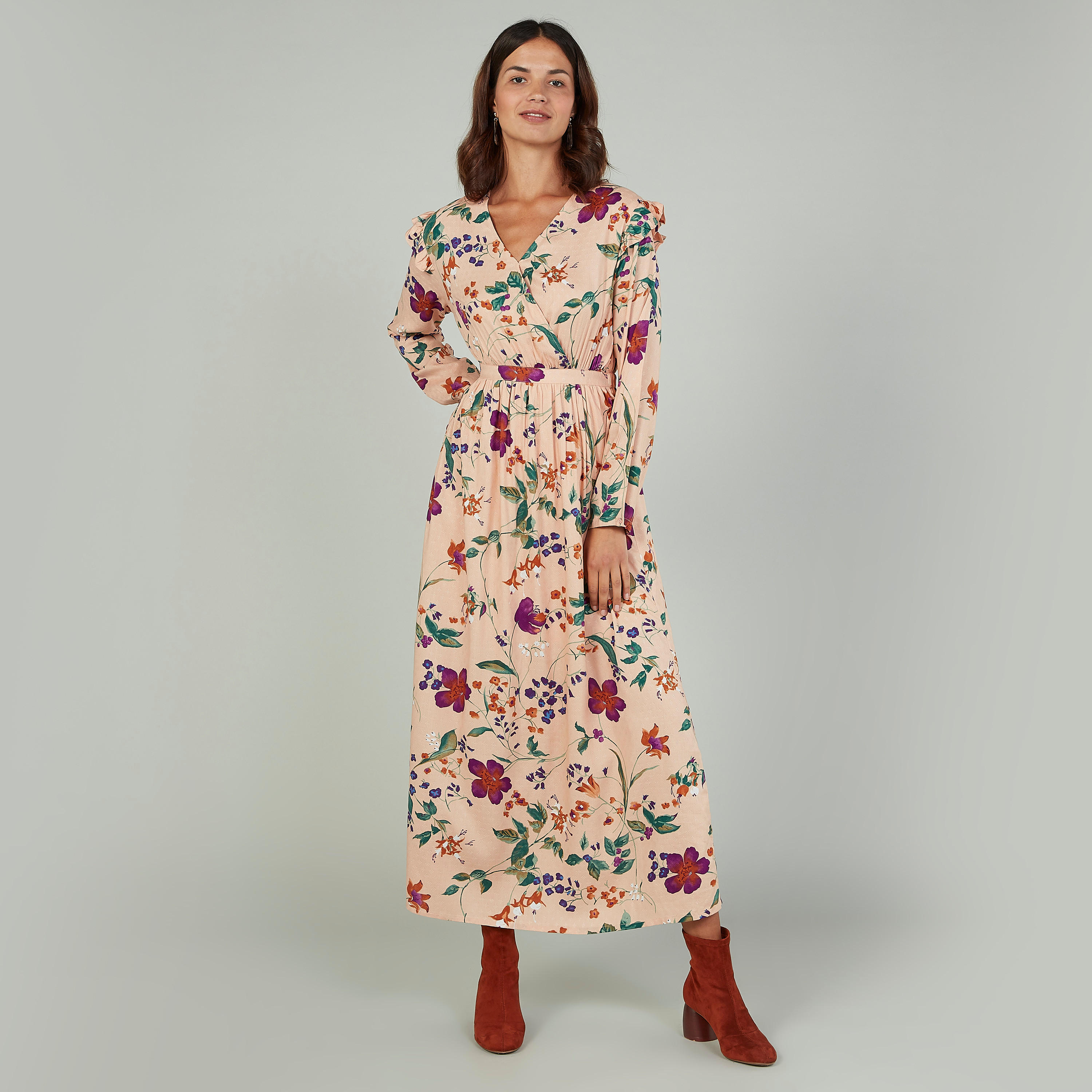 Sustainable Floral Printed Maxi A-line Dress with Long Sleeves