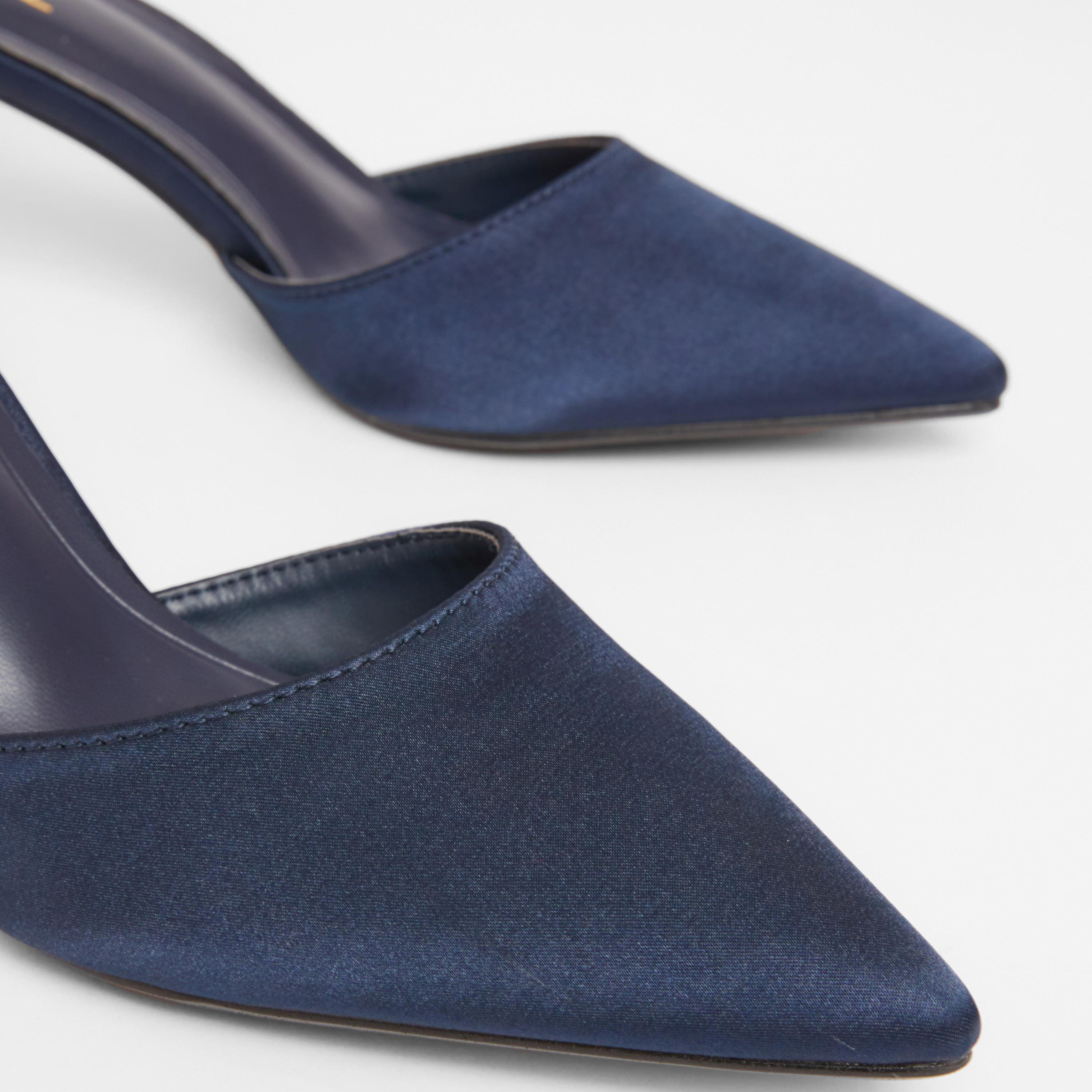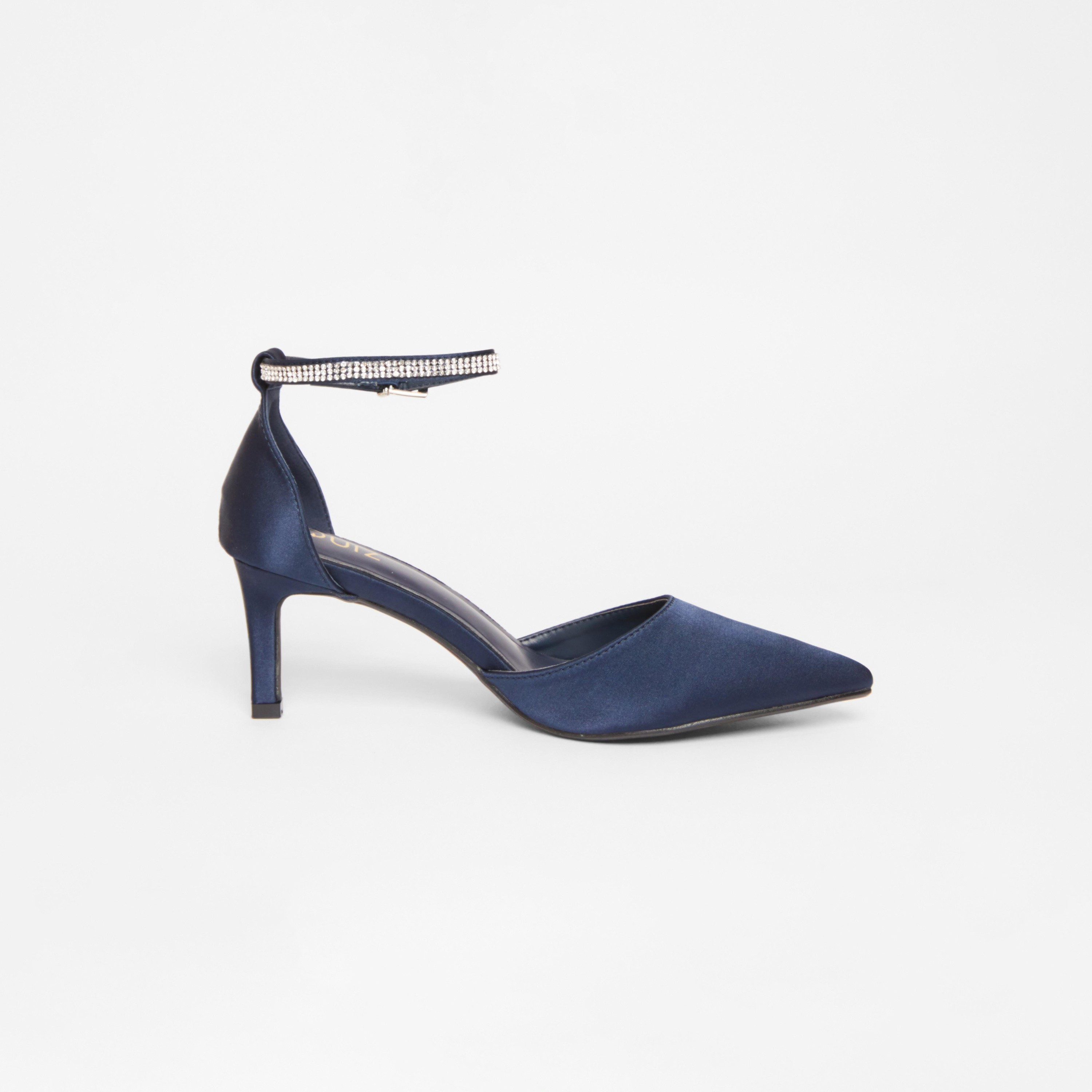 Chic navy court shoe featuring a low stiletto heel and sparkling diamante strap detailing.