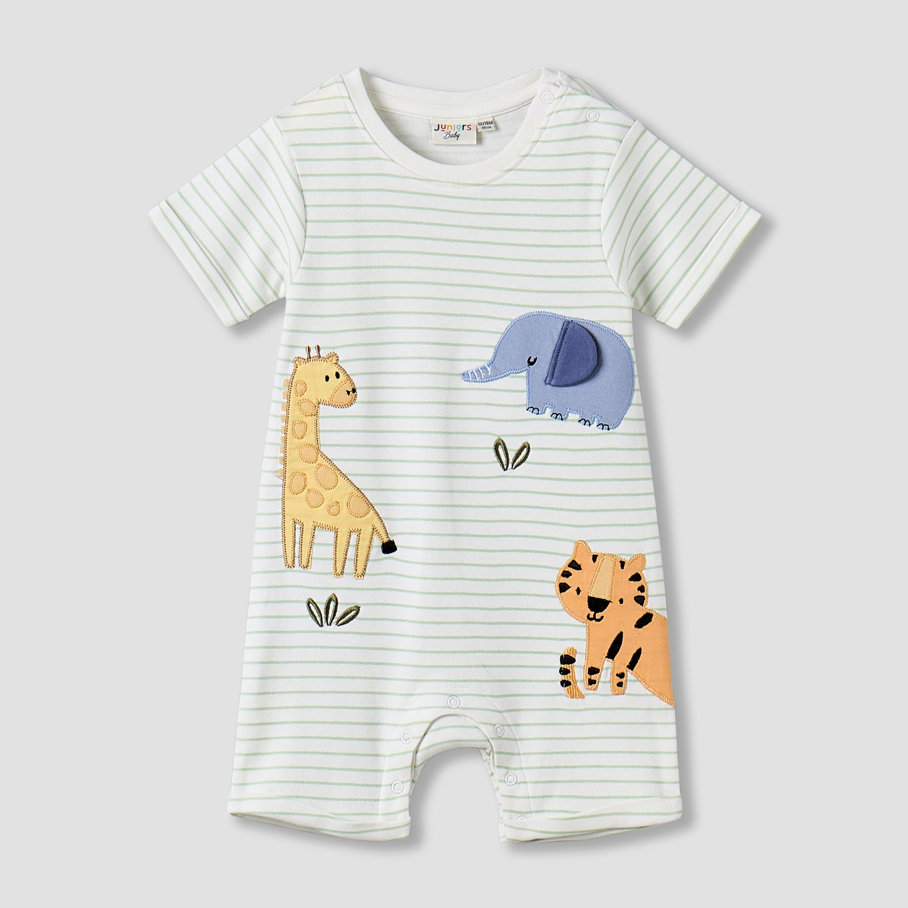 This charming striped romper for babies features delightful animal appliques, including a giraffe, elephant, and tiger. Crafted from soft, breathable fabric, this baby romper ensures optimal comfort for your little one throughout the day. The convenient snap button closure at the shoulder and crotch facilitates effortless changing, making this an essential addition to any baby's wardrobe. This short-sleeved romper is perfect for everyday wear and playful adventures.