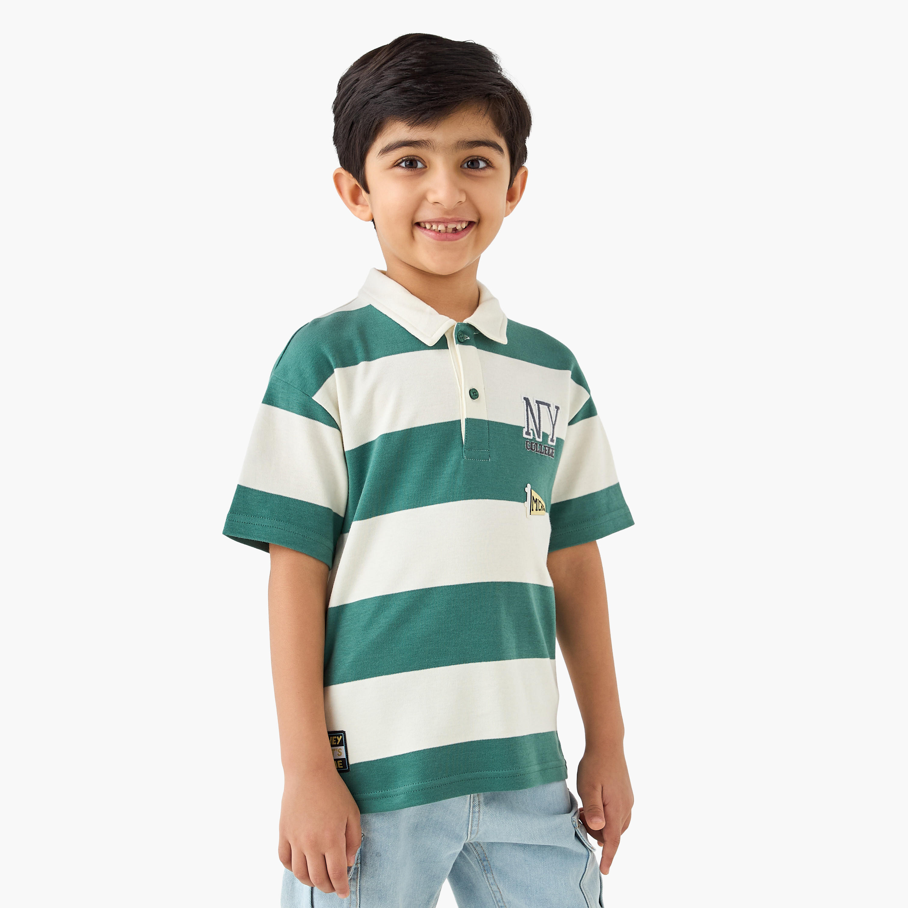 This polo T-shirt features a classic striped design and playful appliqué patches. The soft cotton material ensures comfortable all-day wear, making it perfect for playtime or casual outings. Pair this stylish polo tee with chinos or jeans for a smart, versatile look. This comfortable polo tee is a wardrobe essential for any young boy.