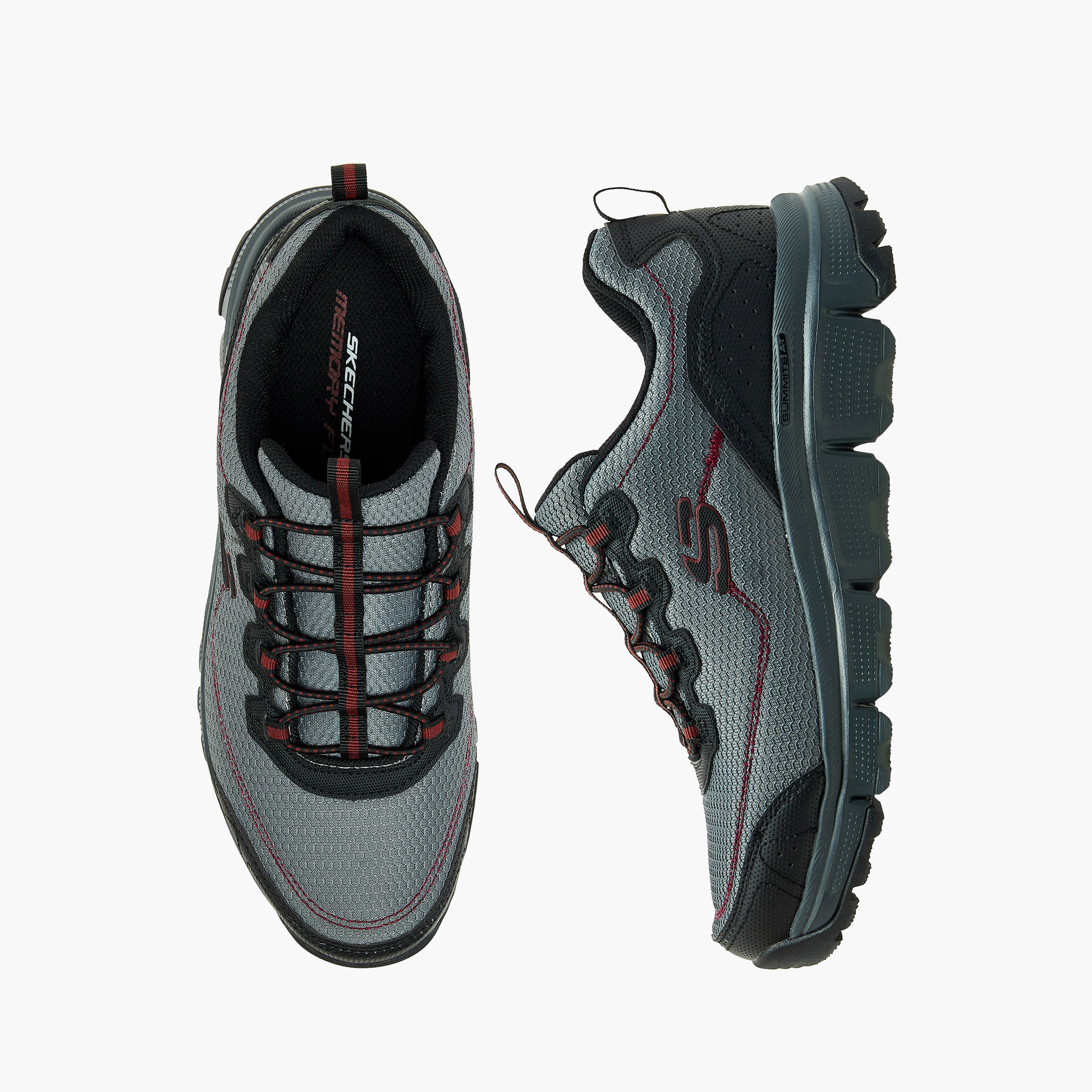 Step up your all-terrain style wearing Skechers Summits AT - Triple Bridges. This sporty outdoor design features a yardage mesh and synthetic overlay upper with fixed stretch laces, a high-traction outsole with flex grooves, and a Skechers Memory Foam cushioned comfort insole.