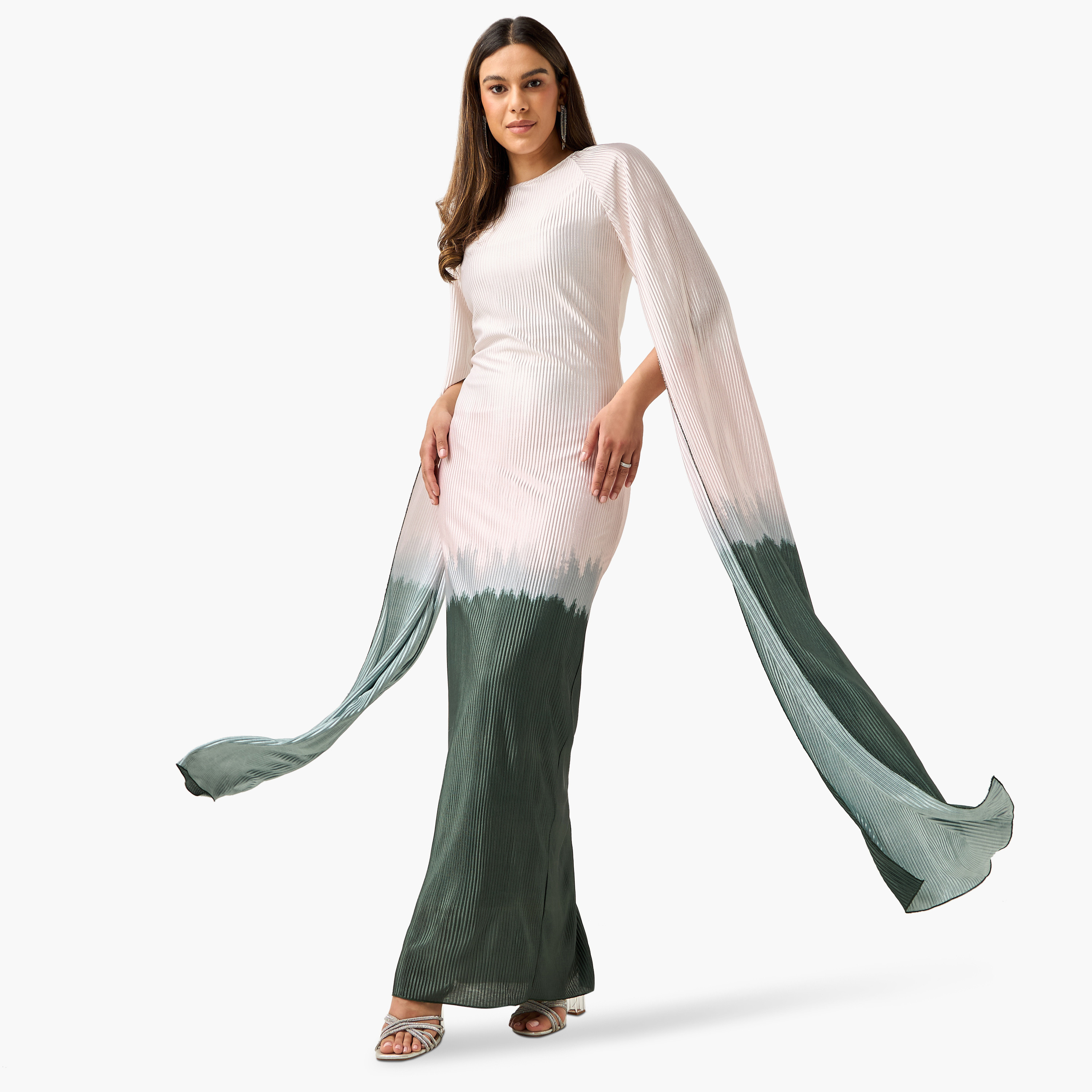 The dress is a stunning blend of elegance and modern style. Featuring a classic round neckline, this dress offers a sophisticated and timeless look. The ombre effect adds a unique and eye-catching gradient of colors, enhancing the pleated design that flows gracefully. The slit long sleeves provide a touch of drama and movement, making this dress perfect for any special occasion where you want to make a memorable impression.