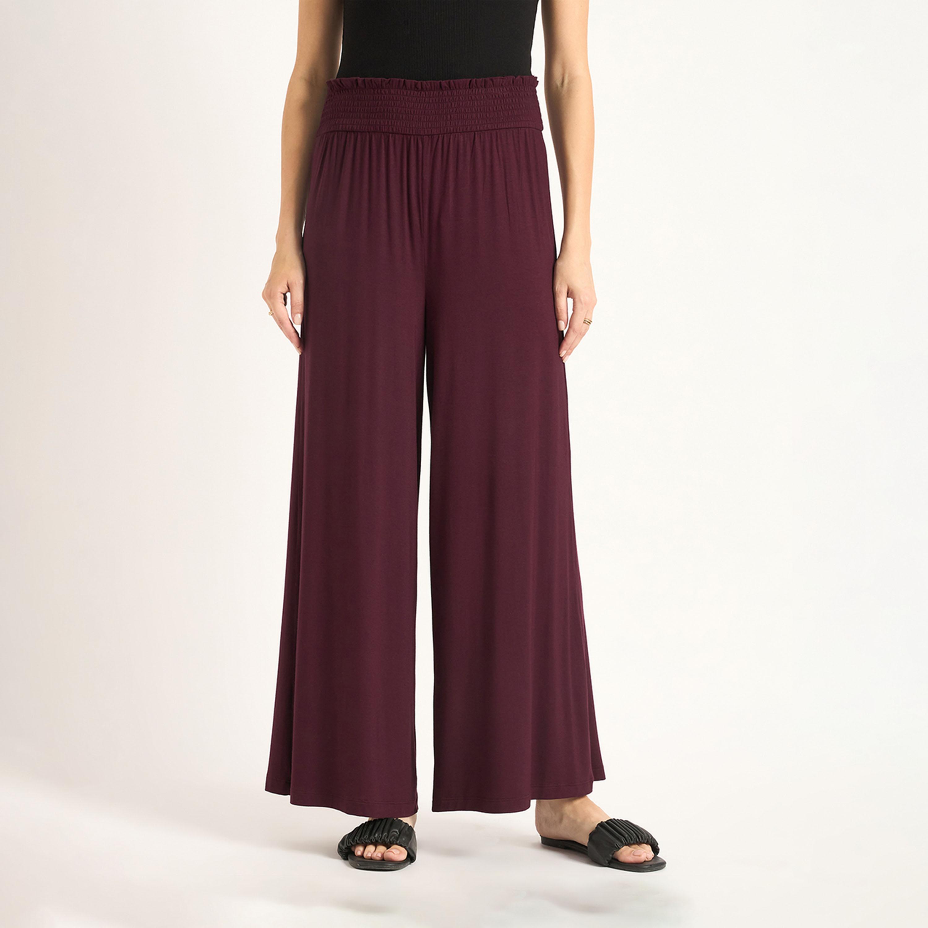 Femmella X Styli Wine Knit Smocking Detail Flared Pants
